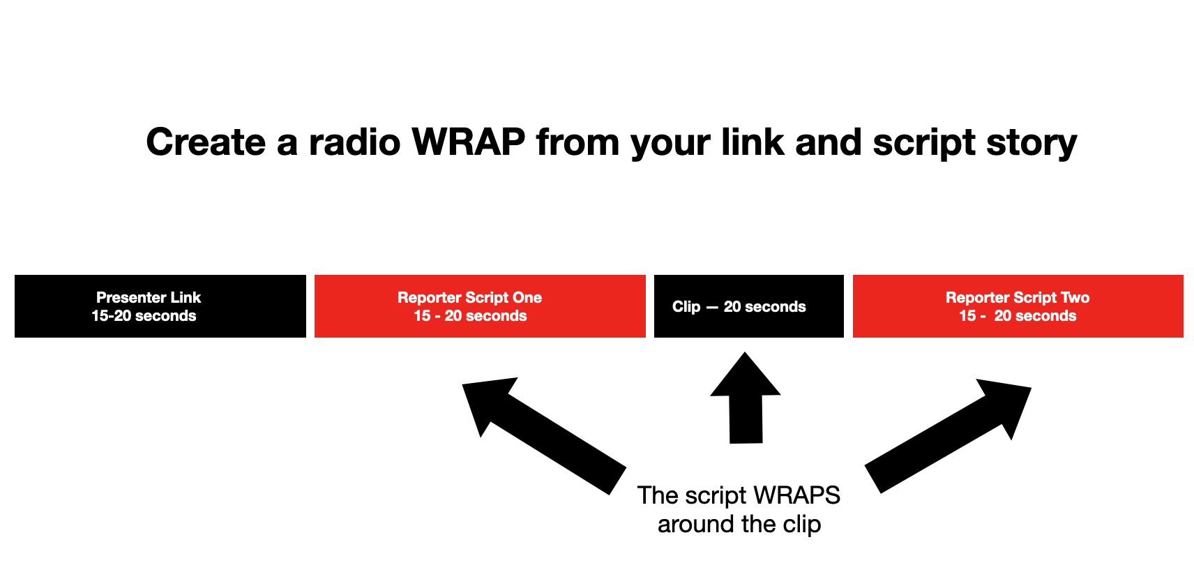 And then there is the WRAP, which has a LINK from the presenter, followed by the reporter reading a script which includes one CLIP. The script wraps around the clip. The duration of a WRAP is normally around 45 seconds to one minute plus a twenty second LINK.