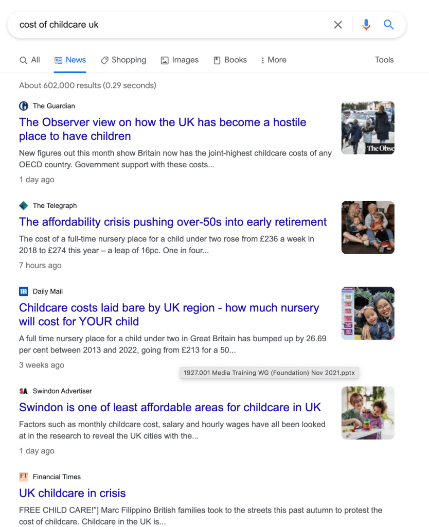 Do a Google News search on “Your subject area + UK” — so, for example “Cost of Childcare UK.” When the results come up, make sure you click on the NEWS tab. A lot of the time the results won’t be any use, but if you do this regularly you will see how your subject is being covered by other journalists and this may give you ideas for case studies or areas to focus on, or leads to follow. Try to do this every day.